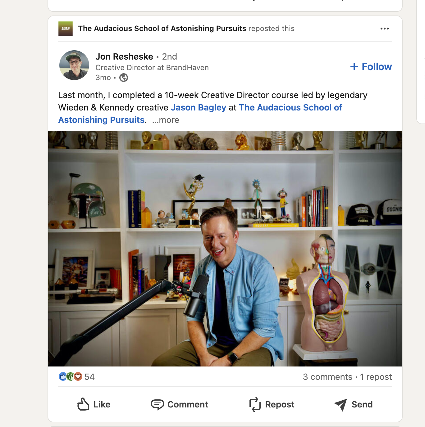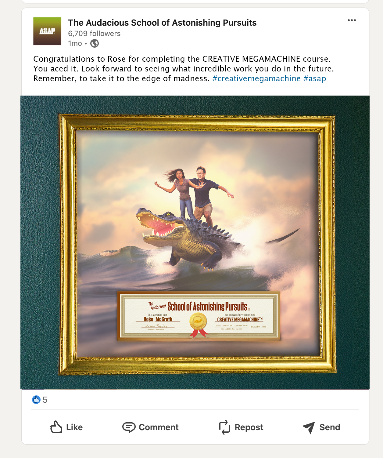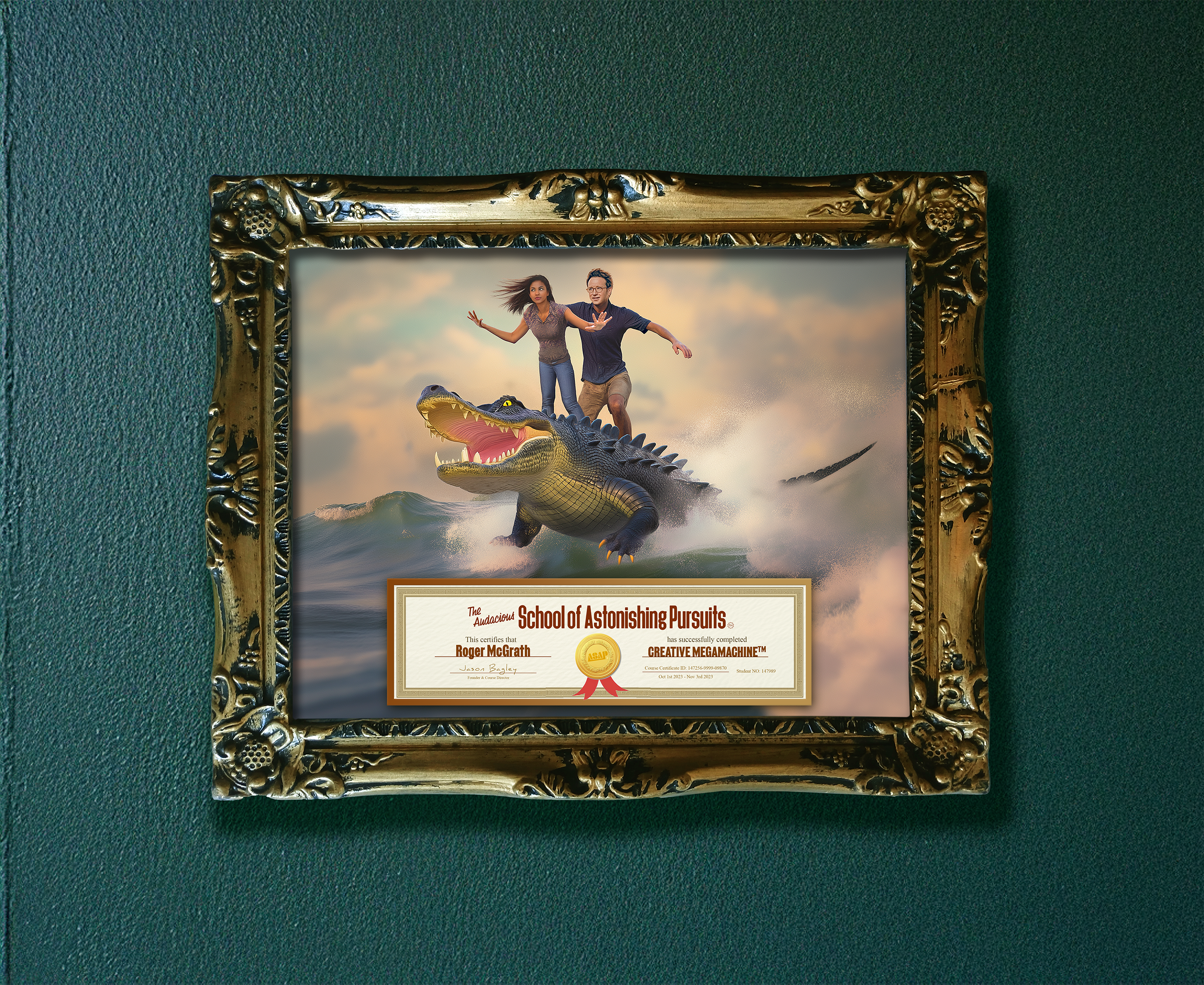 At the School of Astonishing Pursuits, creatives learn to apply former Wieden+Kennedy CCO Jason Bagley’s “7 CD Secrets” to sell and produce world-class work in under 60 days. As a tutor, Jason challenged us to design a certificate for the Creative Megamachine course with one directive: “Just go mad.” The resulting image—featuring Jason surfing on the back of a crocodile alongside a graduate—captures the wildly imaginative spirit he inspired.