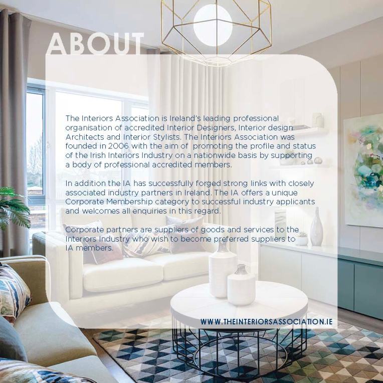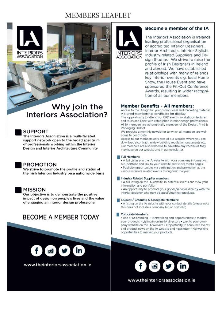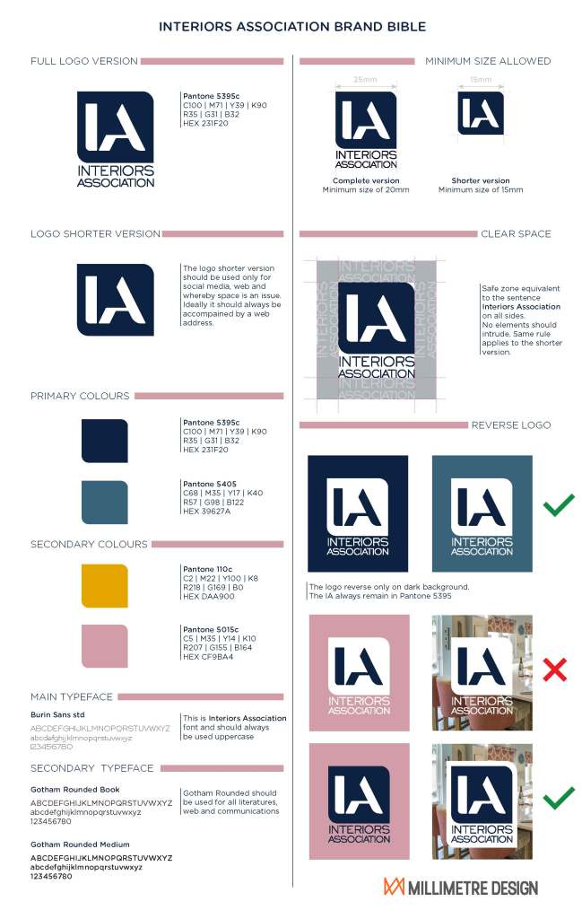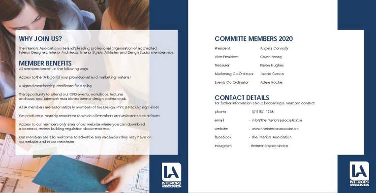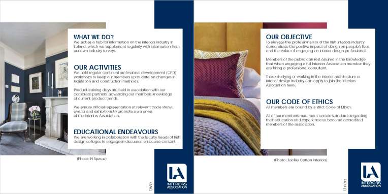 We created a client facing brochure for the Interiors Association, outlining the services Interiors Association offer. The design of the brochure was a reflection of their logo and was applied as a template graphic on all the pages. This helped with consistency and synergy throughout all design assets.